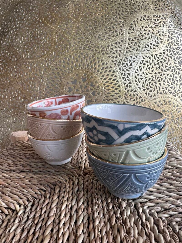 Handbeschilderd lichtgroen kommetje met gouden accenten. Geschikt voor bijv. desserts, of om een geurblokje in te leggen.