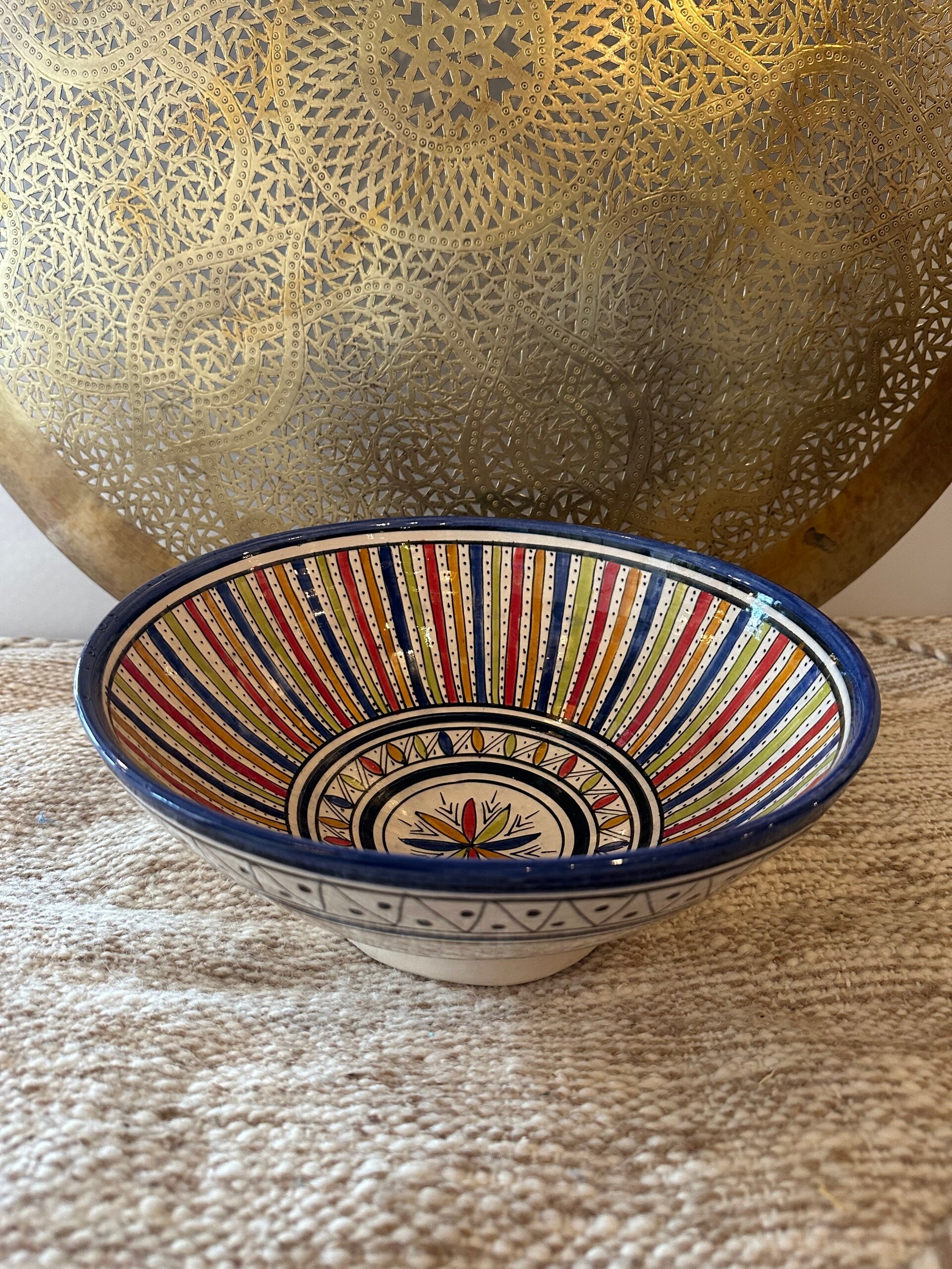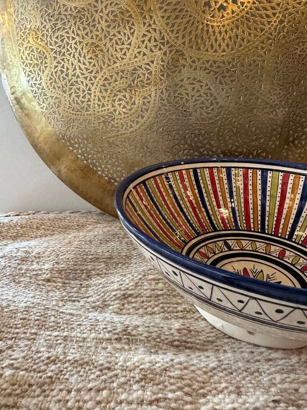 Handgemaakt Marokkaans keramiek uit Safi, Marokko. Ieder item is uniek en heeft een ander motief of kleur. Heel mooi om je eettafel mee aan te kleden. De schalen kun je ook aan de wand hangen.