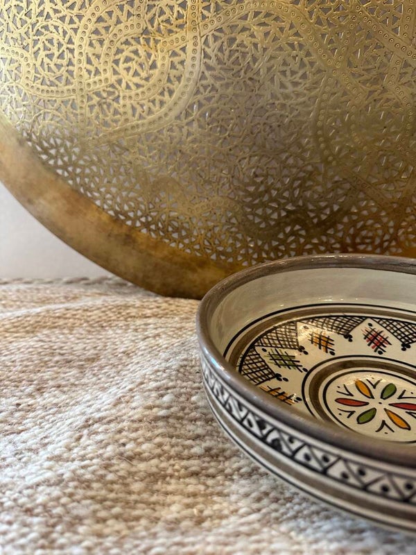 Handgemaakt Marokkaans keramiek uit Safi, Marokko. Ieder item is uniek en heeft een ander motief of kleur. Heel mooi om je eettafel mee aan te kleden. De schalen kun je ook aan de wand hangen.