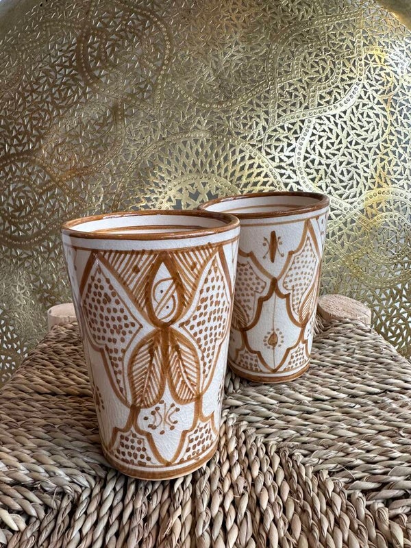 Handgemaakt Marokkaans keramiek uit Safi, Marokko. Ieder item is uniek en heeft een ander motief of kleur. Heel mooi om je eettafel mee aan te kleden. De mokken kun je ook als bloempotje gebruiken, bijv kleine vetplantjes etc.