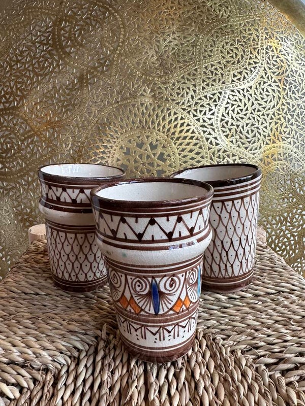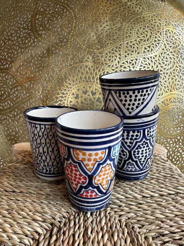 Handgemaakt Marokkaans keramiek uit Safi, Marokko. Ieder item is uniek en heeft een ander motief of kleur. Heel mooi om je eettafel mee aan te kleden. De mokken kun je ook als bloempotje gebruiken, bijv kleine vetplantjes etc.