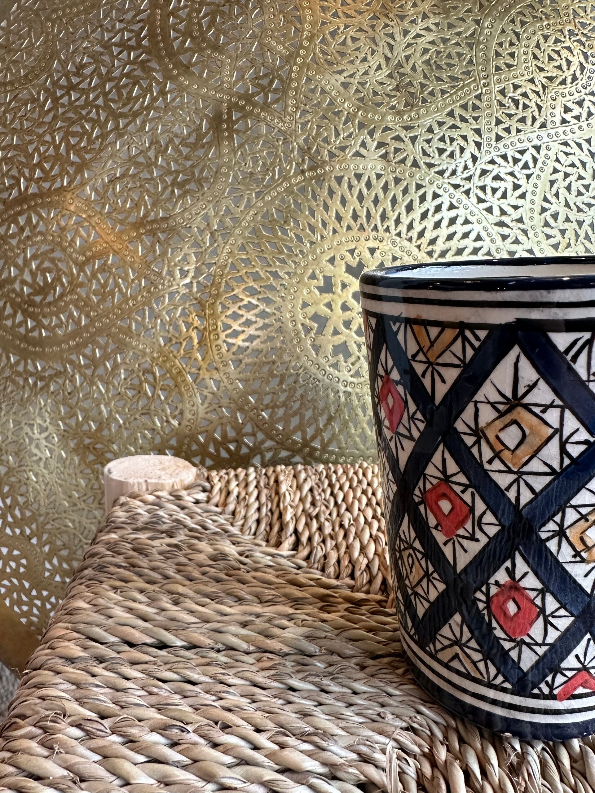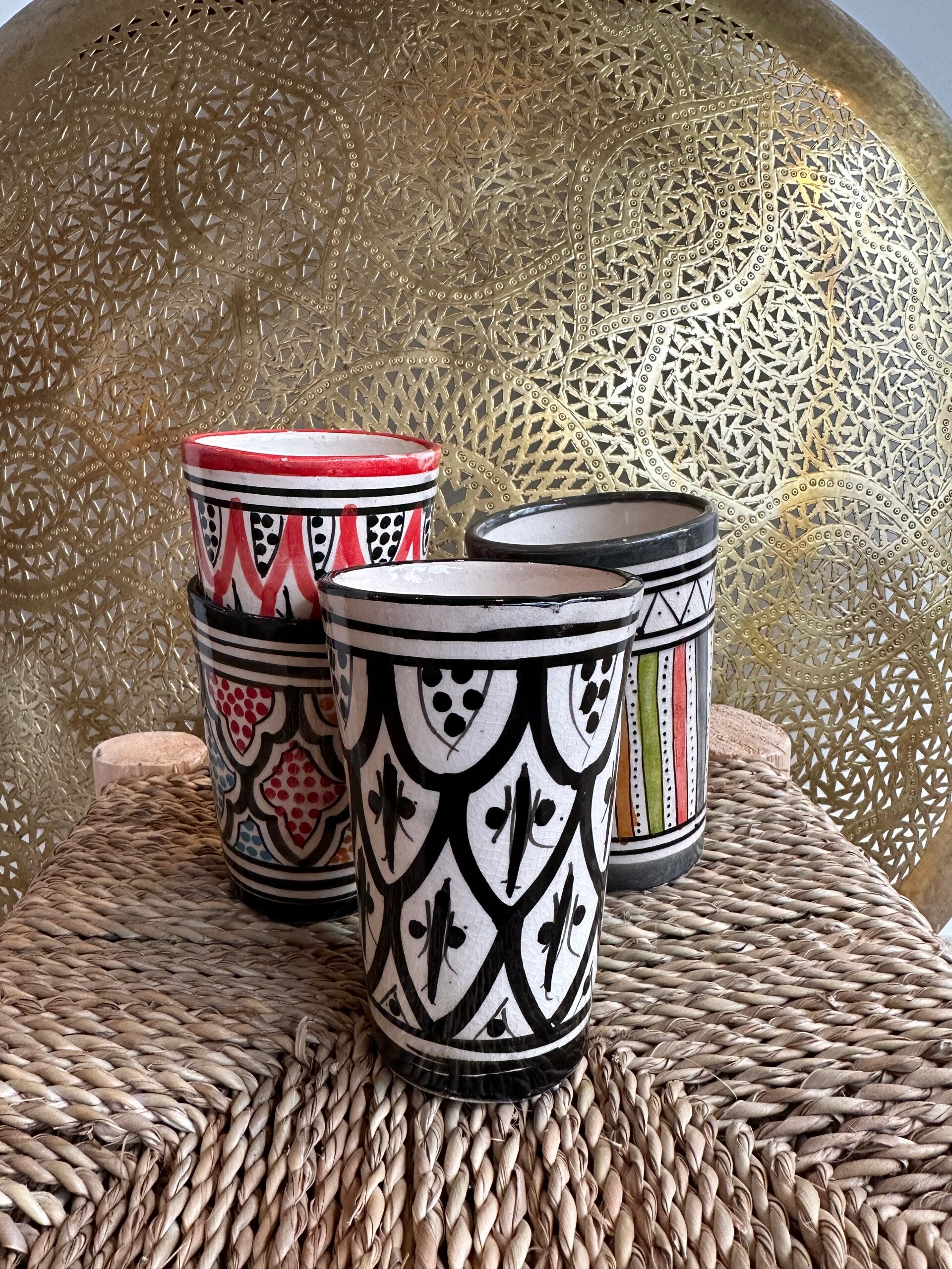 Handgemaakt Marokkaans keramiek uit Safi, Marokko. Ieder item is uniek en heeft een ander motief of kleur. Heel mooi om je eettafel mee aan te kleden. De mokken kun je ook als bloempotje gebruiken, bijv kleine vetplantjes etc.