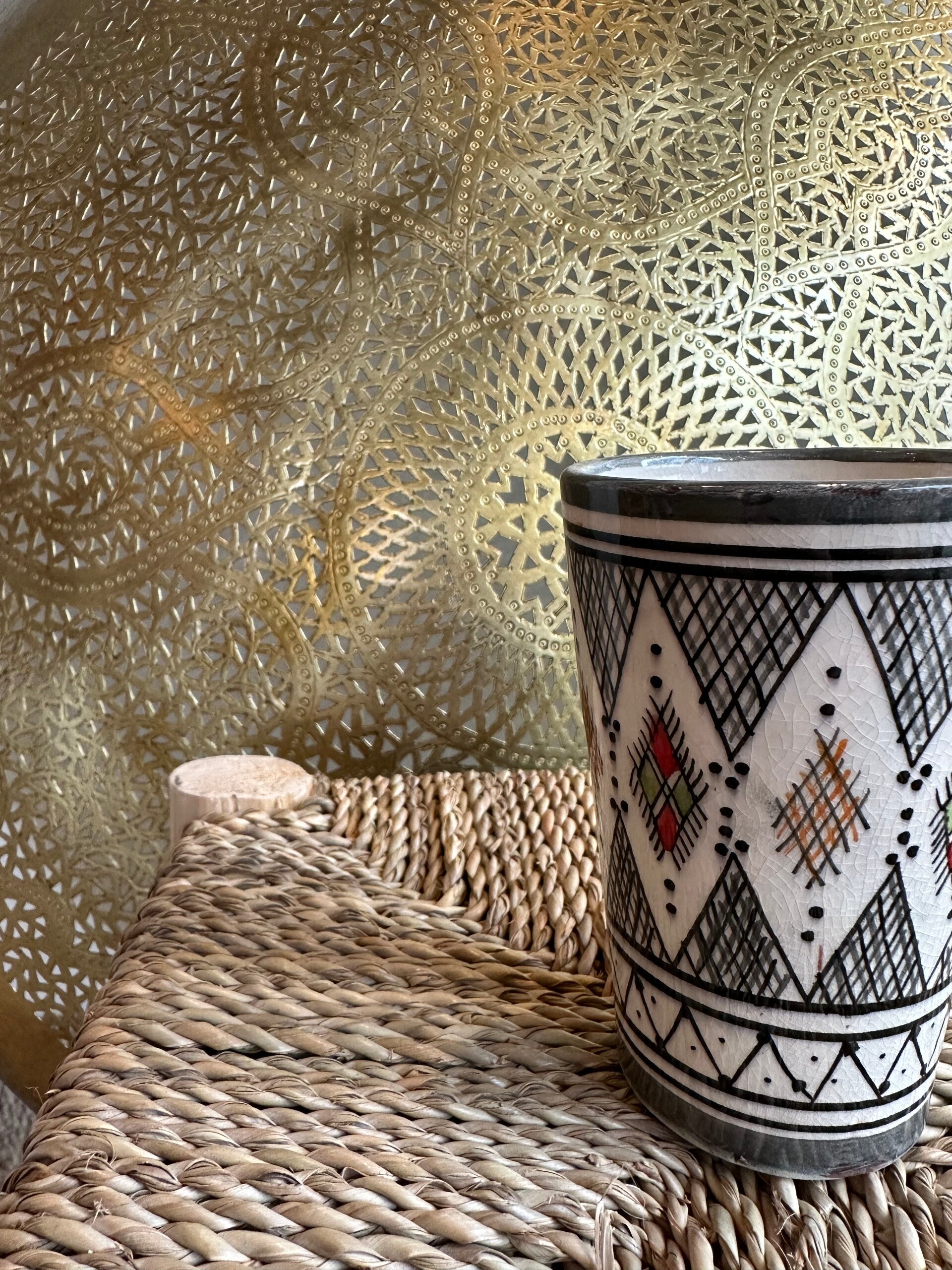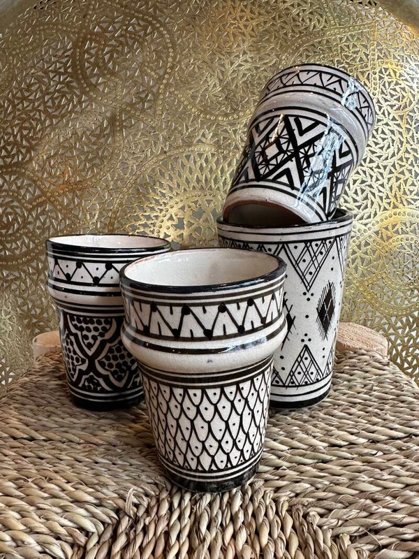 Handgemaakt Marokkaans keramiek uit Safi, Marokko. Ieder item is uniek en heeft een ander motief of kleur. Heel mooi om je eettafel mee aan te kleden. De mokken kun je ook als bloempotje gebruiken, bijv kleine vetplantjes etc.