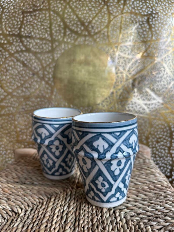 Handbewerkte wit/blauw mok met gouden accenten voor warme en koude dranken. Ook leuk als bloempotje.
