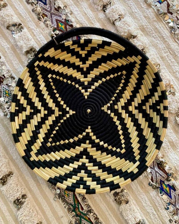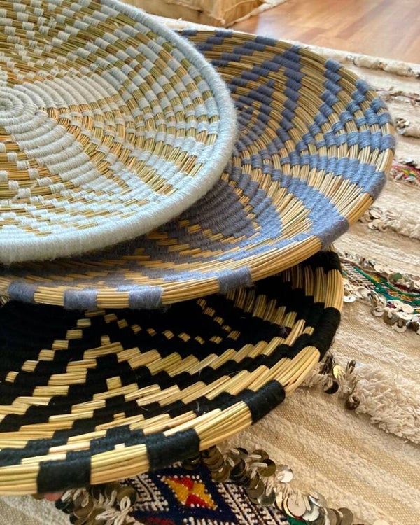 Handgeweven schaal van zeegras en katoen met mooie patronen. Verkrijgbaar in drie verschillende kleuren: lichtblauw, grijs en zwart. Decoratief voor op tafel, geschikt om bijvoorbeeld tijdschriften op te leggen. Ook als fruitschaal te gebruiken.