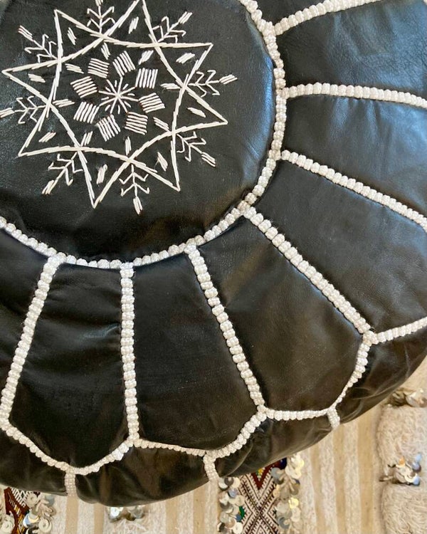 WZwarte leren poef met decoratieve stiksels.