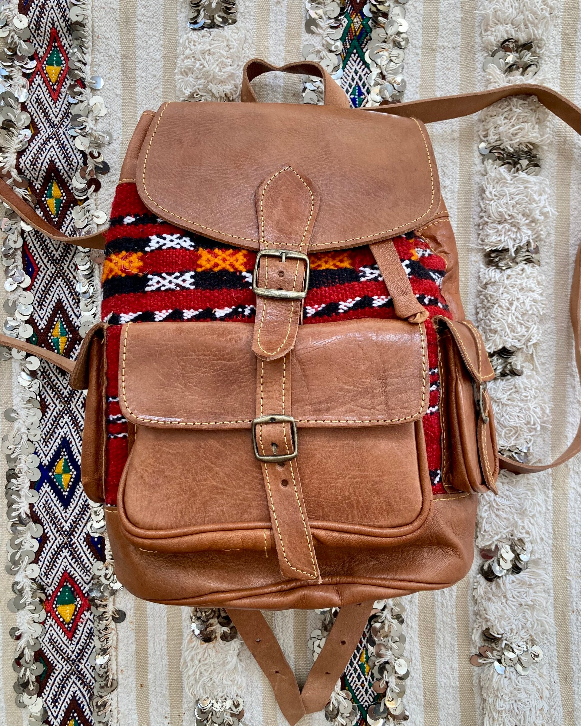 Stevige handgemaakte leren rugzak met stukken van geweven tapijt.