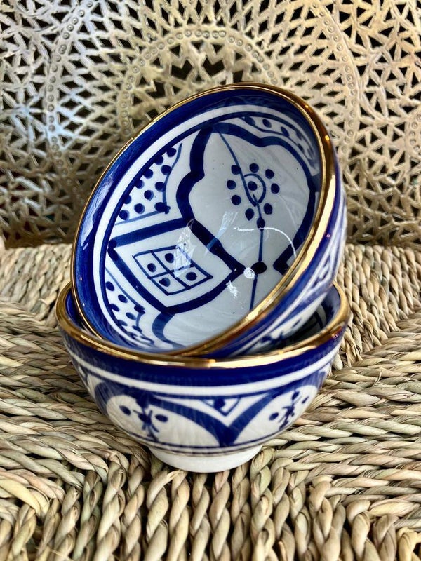 Handbeschilderd blauw/wit kommetje met gouden accenten. Geschikt voor bijv. desserts, of om een geurblokje in te leggen.